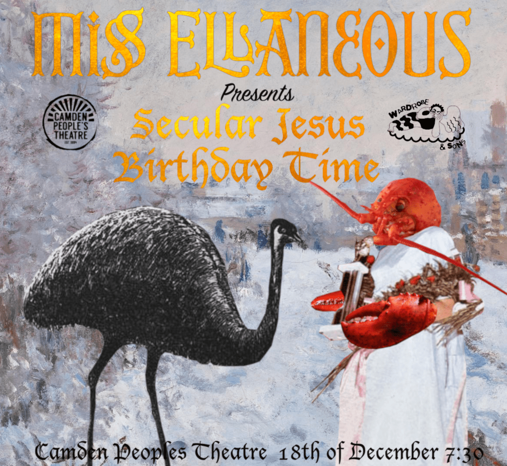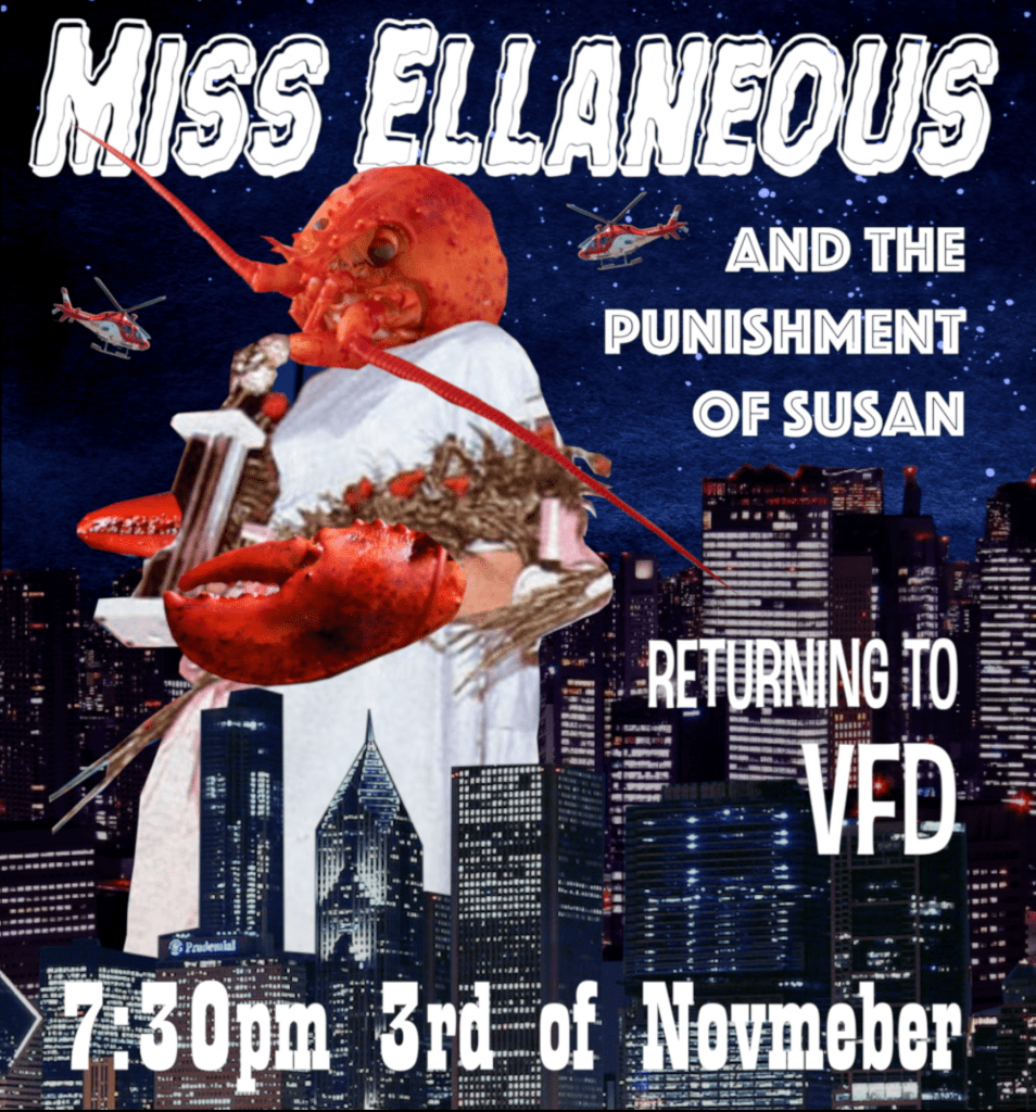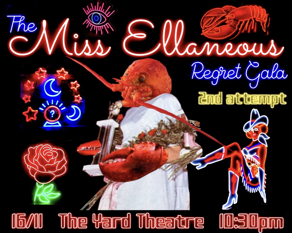 Miss Ellaneous is a night started in 2023 by Charlie Wood and Frankie Thompson. It began after a discussion about how they both felt they were making work that didn’t easily fit into a definable category of performance. The natural solution was to create an event for misfits and artists who defy the boundaries of drag/comedy/live art/spoken word/clowning etc etc and Miss Ellaneous, who for some reason took the form of a lobster prom queen, was born.