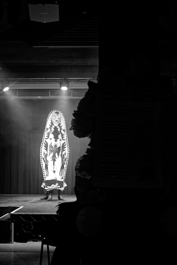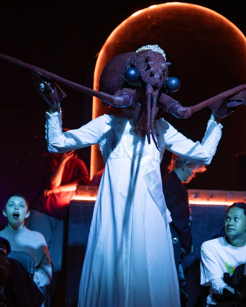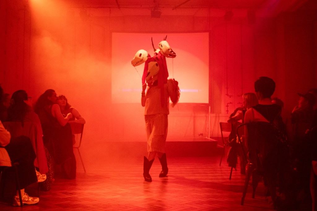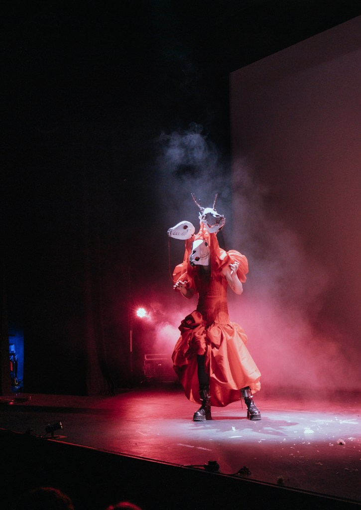 SETH was a piece made for Diverse Alarums – a cabaret produced by Marlborough Productions and lead by Emma Frankland and Subira Joy. It was a work developed as a conversation between performance artists and academics to respond to the idea of queer histories and was performed at The Attenborough Centre for the Creative Arts in 2025. My piece looked into palaeolithic queerness, imagining a trans goddess that existed before recorded history. The performance itself recounted an experience I had being followed home late at night and a dreaming I had about being saved by this goddess. I then emerged in the costume – headpiece by me and dress by Lambdog and lipsynced (with all four heads) to the song ‘SETH’ by Tom Rassmussen. Photos by Damien Frost, Kaleidoshoots, Clem Rebourg and Takenya Holness