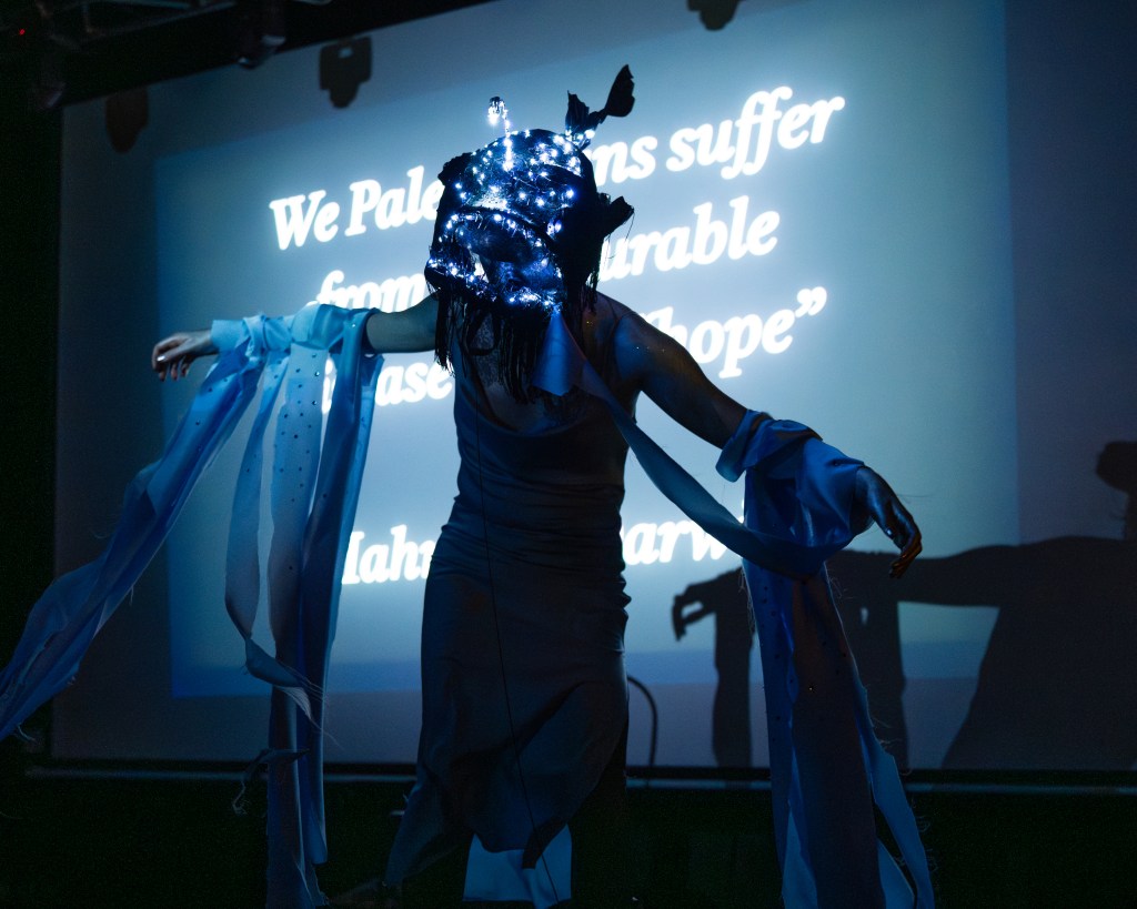 The Angler Fish performance was a piece made for the Be Gay, Boycott Eurovision event in 2025. It was made to be a piece about hope in the face of dark times and drew on the recent viral sensation of a small deep sea angler fish that had somehow swam to the surface and been discovered by some fishermen. This little fish became a strange little symbol of hope and I expanded on this meaning for the event by creating a little light up mask of this fish (a TikTok I made detailing this process can be found here) and using it to lipsync to ‘No Light, No Light’ by Florence and the Machine as well as adding the quote by the Palestinian poet Mahmoud Darwish – “We Palestinians suffer from an incurable disease called ‘hope’”. Photos by James Klug